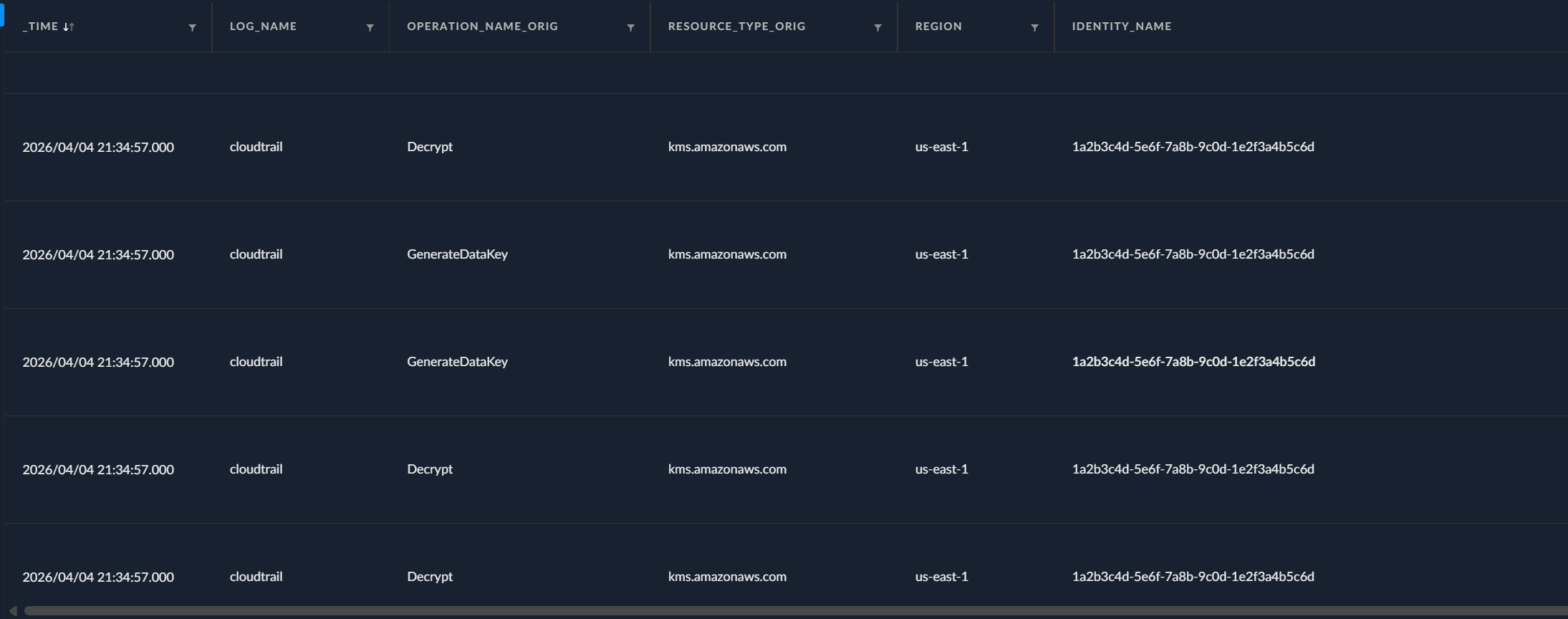 If we pivot to our SIEM we can however notice something interesting. ✨ Something ✨ still happened! We seen a shit ton of Decrypt events and some GenerateDataKey sprinkled throughout.
